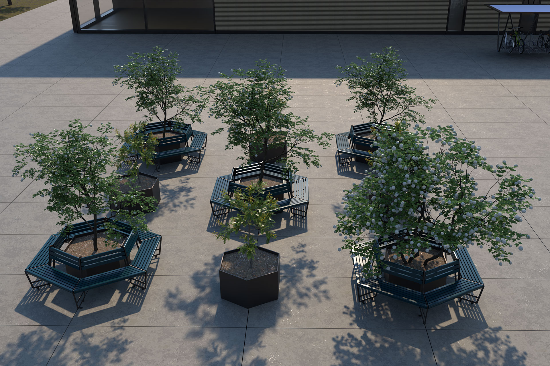 Ergänzend zur hexagonalen Sitzbank ist ein passender Pflanzentopf erhältlich, der die mittige Fläche optimal ausnutzt.