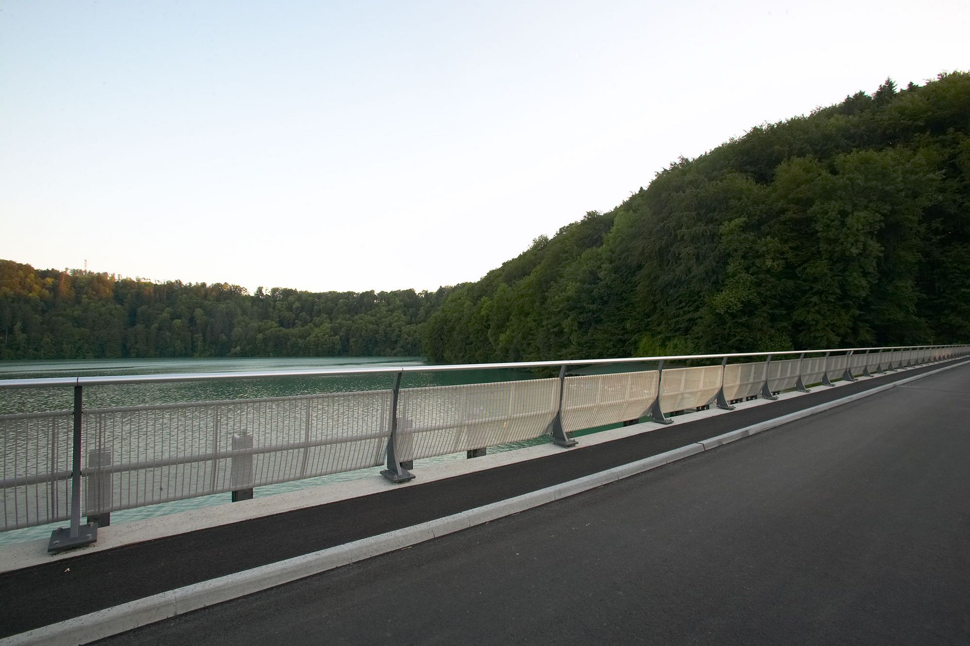 Die Absturzsicherung dient gleichzeitig als Beleuchtungselement - auf eine herkömmliche Strassenbeleuchtung konnte verzichtet werden. Um die LED integrieren zu können, haben wir in Zusammenarbeit mit den Architekten ein spezielles Strangpressprofil aus Aluminium entwickelt. Edelstahl-Architekturgewebe dienen als Füllungen des Strassengeländers